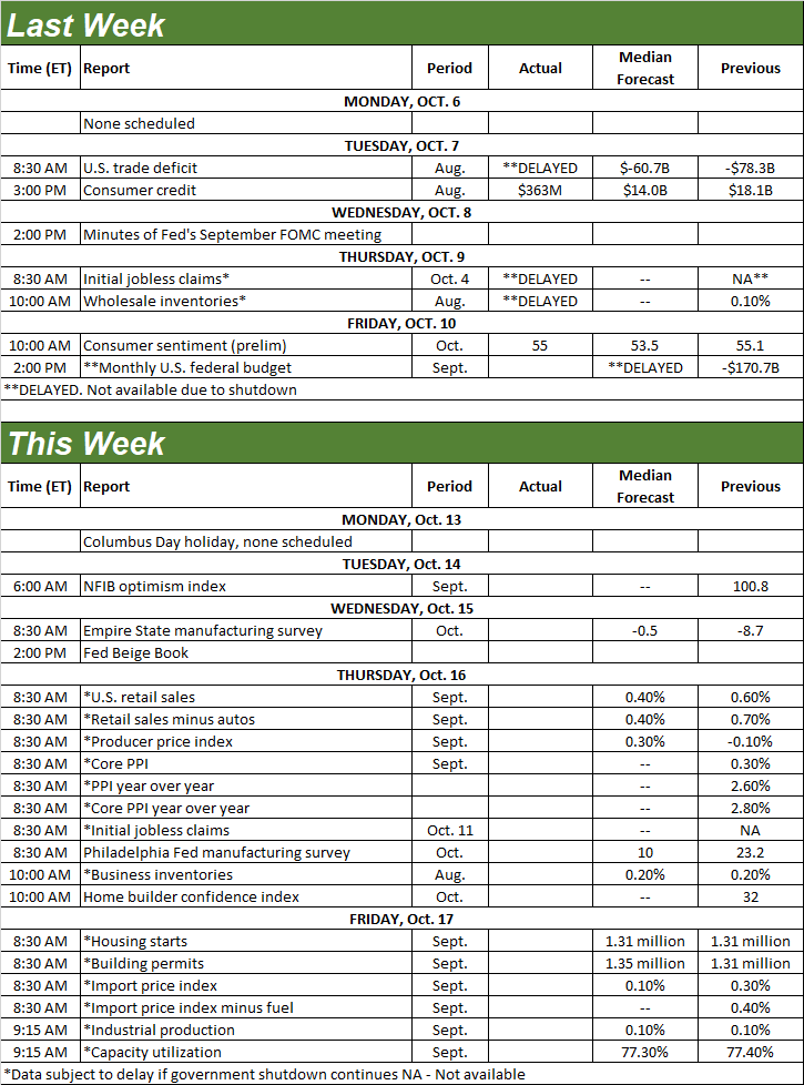 Really, there weren’t any main financial bulletins launched final week, largely as a result of shutdown. Even with no shutdown although, there wouldn’t have been a lot. We stay much more taken with final month’s jobs knowledge, which was due per week in the past, however has been delayed by the shutdown. We’ll take our look after we lastly have the info in-hand.